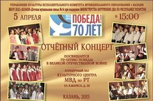 5 апреля в концертном зале Культурного центра МВД по РТ состоится отчетный концерт МБОУДОД г. Казани «Детская музыкальная школа №8». Концерт посвящен 70-летию Победы в Великой Отечественной войне. Гостями концерта станут ветераны войны, ветераны школы, сотрудники органов внутренних дел Республики Татарстан, родители, учащиеся. В концертной программе примут участие творческие коллективы школы и солисты – победители международных, всероссийских и республиканских конкурсов.
