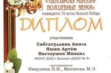 ДИПЛОМ участника Сибгатуллина Аниса, Яшин Артем, Настаушев Михаил на VI Открытом фестивале ансамблевого музицирования "Тылсымлы авазлар Волшебные звуки"