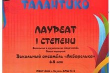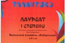 Международный интернет-конкурс для детей, молодежи и взрослых "Талантико" Вокальный ансамбль "Акварелька"(вокал эстрадный) ДИПЛОМ Лауреата I степени