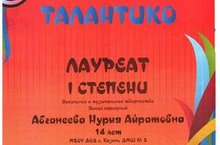 Международный интернет-конкурс для детей, молодежи и взрослых "Талантико" Абганеева Нурия (вокал эстрадный) ДИПЛОМ Лауреата I степени