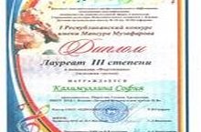 ДИПЛОМ Лауреата III степени в номинации "Фортепиано"(младшая группа) на I Республиканском конкурсе имени Мансура Музафарова.