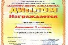 Ежегодный Международный фестиваль-конкурс детского и юношескго творчества "Детство цвета апельсина" в номиации "инструментальное исполнительство-фортепиано" ДИПЛОМ Дипломанта I степени.