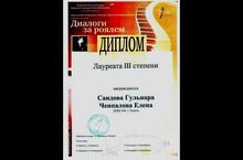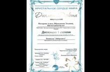 Награжден ансамбль Насырова Алиса, Ибрагимова Эльвина, Нигметзянов Булат ДИПЛОМОМ Дипломанта I степени на Ежегодном международном конкурсе-фестивале детского и юношеского творчества "Хрустальное сердце мира" в номинации "инструментальное исполнительство гитара" ансамбль.