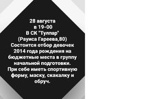 28 августа 2020г приглашаются на отбор желающие заниматься в нашей школе на бюджетной основе, достигшие возраста 6 лет. (дети 2014 год рождения). При себе иметь спортивную форму, маску, скакалку и обруч.