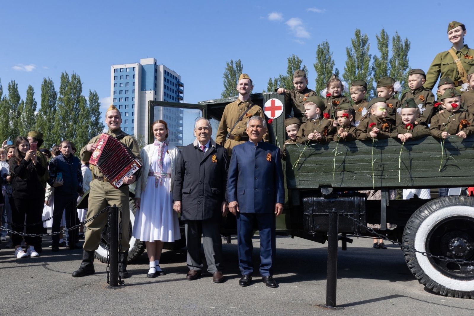 Сегодня в парке Победы прошла церемония возложения цветов и венков к Вечному огню, в которой приняли участие Раис Республики Татарстан Рустам Минниханов, Премьер-министр РТ Алексей Песошин, председатель Госсовета РТ Фарид Мухаметшин, Государственный советник РТ Минтимер Шаймиев, Мэр Казани Ильсур Метшин и ветераны войны.