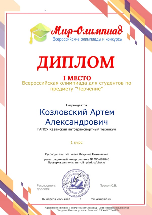 Поздравляем студента 1 курса группы МР 219-2 , КОЗЛОВСКОГО АРТЕМА, занявшего 1 место во Всероссийской олимпиаде для студентов по предмету "Черчение".