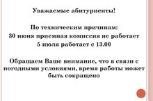 Уважаемые абитуриенты! По техническим причинам 30 июня приемная комиссия не работает, 5 июля работает с 13.00ч.