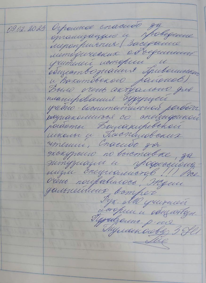 Также с большим интересом учителя посетили музейные экспозиции ДШИ, посвященные Музыкальному образованию г. Казани XIX века; композитору и общественному деятелю М.А. Балакиреву, его последователю В.Н. Пасхалову, деятельности Всероссийского общественного движения «Балакиревский союз». Участники районного объединения оставили свои положительные отзывы о мероприятии в нашей Книге отзывов.