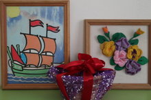 Воспитатель Семенеева З.А., совместно с воспитанниками подготовительной группы № 4 предоставили две картины ручной работы: "Песочный кораблик" и "Фиалки".