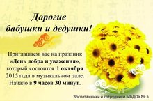 Приглашаем вас на праздник "День добра и уважения", который состоится 1 октября 2015 года в музыкальном зале. Начало в 9 часов 30 минут.
