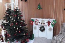 Как театр начинается с вешалки, так и детский сад начинается с холла. А в холл детского сада уже пришел Новый год. Для родителей и детей, с целью создания праздничного предновогоднего настроения, педагогами детского сада была создана фотозона с традиционными атрибутами зимнего праздника:елкой, Дедом Морозом, снеговиками, камином и разноцветными гирляндами.