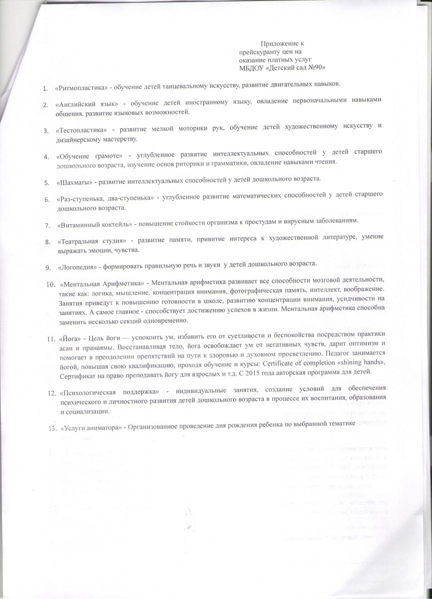 - Приложение к прейскуранту цен на оказание платных услуг