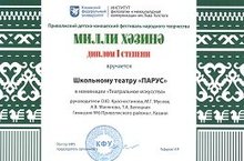 28 ноября – 1 декабря 2017 года в Институте филологии и межкультурной коммуникации им. Льва Толстого Казанского федерального университета прошел фестиваль «Милли хәзинә». Наш школьный театр "Парус" участвовал в номинации "Театральное искусство" и занял I место. Поздравляем руководителей О.Ю.Красностанову, А.В.Малянову, М.Г.Мусову, Т.А.Белоцкую и юных артистов: Гимазова А., Романова Е., Гизатуллина Э., Хисамова А., Кабирова М., Каримова И., Кузьмина Н.,Чинилкину Д., Бокучава Н.,Кудрину Л., Кислову А., Тихонову В., Белову Н. Молодцы!