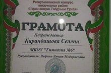 Поздравляем ученицу 6 класса гимназии №6 Карандашову Селену (учитель Вафина Л.М.) с победой в Республиканском конкурсе творческих работ "Герои сказок Габдуллы Тукая"!