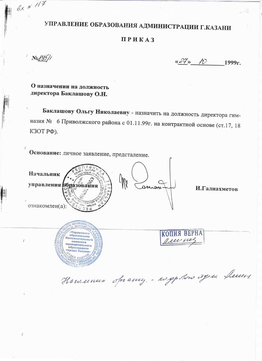 - Приказ Учредителя о назначении на должность директора гимназии № 6