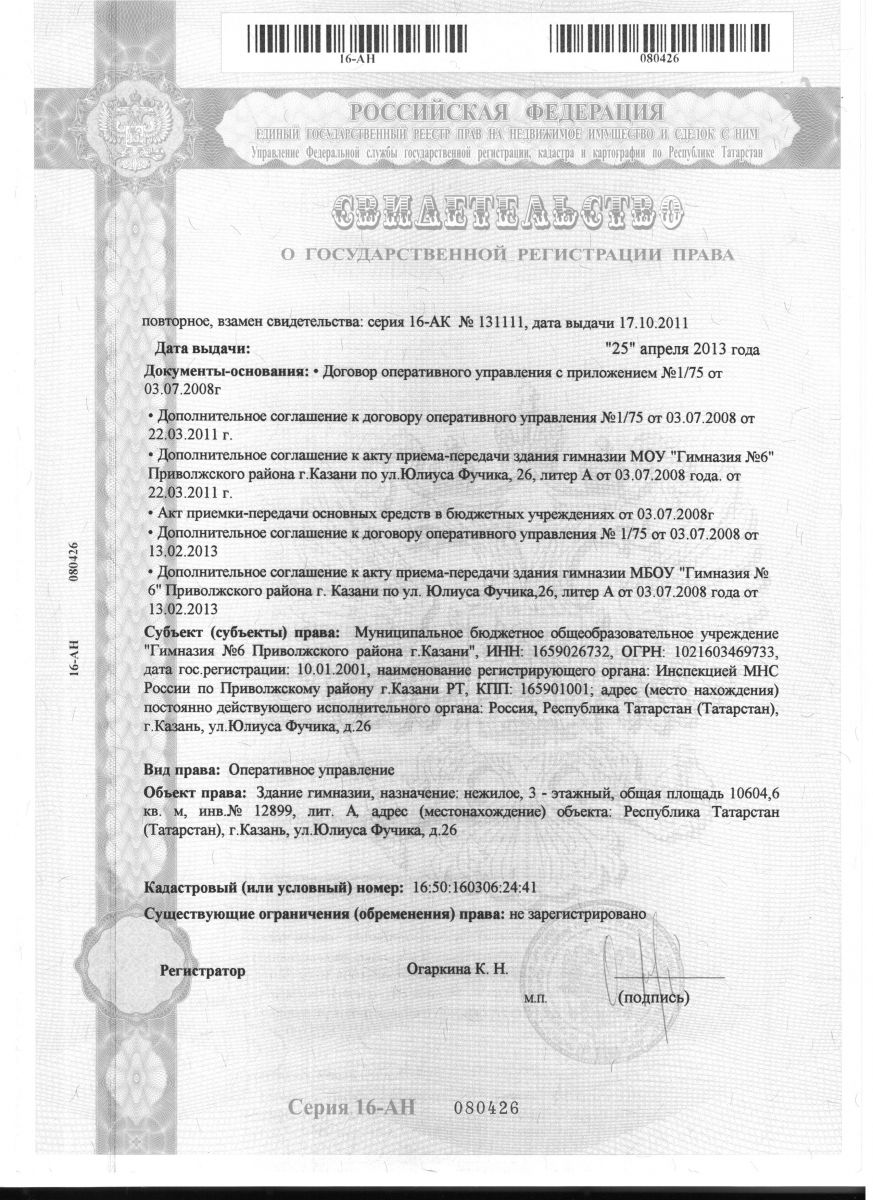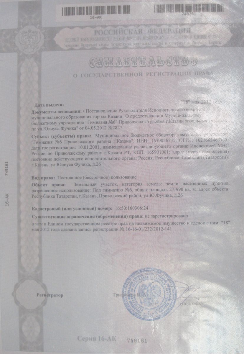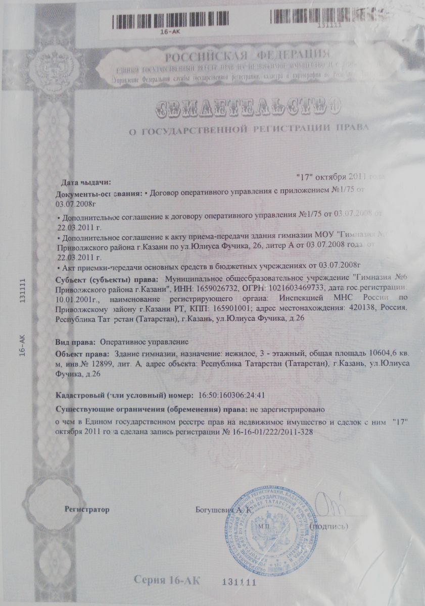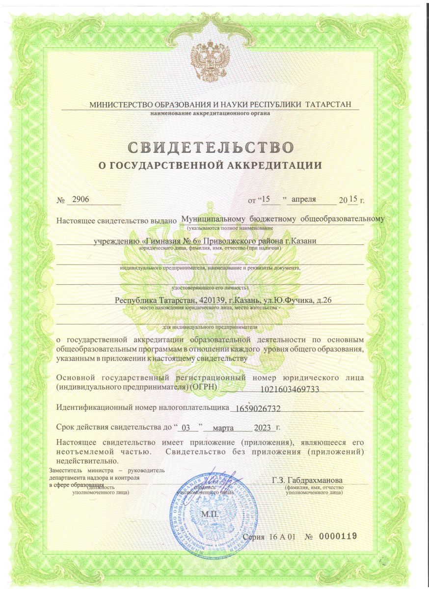 - Свидетельство о внесении в единый государственный реестр МБОУ Гимназия 6