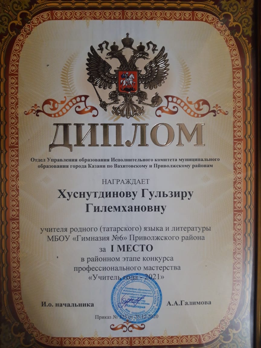 «Учитель татарского языка и литературы» - Хуснутдинову Гульзиру Гилемхановну-Диплом I степени!