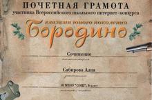 Поздравляем Сабирову Алию, ученицу 6Б класса за участие во Всероссийском школьном интернет-конкурсе "Бородино глазами юного поколения"и получением Почетной грамоты участника данного конкурса. Желаем дальнейших успехов!