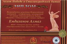 Поздравляем Емдиханова Алмаза, ученика 10 класса с награждением Диплома участника Всероссийской интернет-конференции, посвященной 70-летию Сталинградской битвы "Память о Сталинграде в наших сердцах". Желаем дальнейших успехов!
