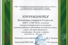 Поздравляем учащихся 8А класса Зиннатова Нияза, Галиаскарова Ильдара, Замалееву Эльвиру, Миннехузина Инсафа и Гайнутдинова Алмаза с победой в районном конкурсе «Театральная гостиная» в рамках фестиваля английского языка «Алло, мы ищем таланты!»! (руководитель Шамиева Э.С.)