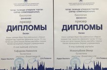 Поздравляем ученика 9 класса Исмагилова Амира и ученицу 8 класса Гафурову Камиллу с дипломами призеров городской олимпиады на татарском языке по биологии. Учитель - А.М.Ахметова. Желаем дальнейших успехов!