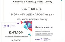 Поздравляем ученика 9а класса Хасянова Ильнара с дипломом победителя и ученицу 9а класса Изосимову Полину с дипломом призера олимпиады «ПРОФЛингва» по английскому языку, организованного Казанским кооперативным институтом. Учитель - А.И.Сайманова. Желаем дальнейших успехов!