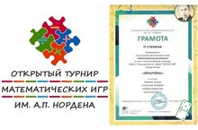 С 25 октября по 27 октября в г.Казани состоялся открытый турнир математических игр им. А.П. Нордена. За успешное выступление в игре "Математическое домино" в лиге 5 классов сборная команда нашей гимназии (Бариев Анвар, Набиев Нурислам, Гатауллин Альберт, учитель Заббарова А.А.) и МБОУ «Многопрофильная полилингвальная гимназия №180» (Шигапов Адиль) награждена грамотой II степени. Поздравляем с успешной игрой!