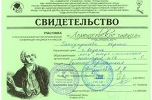 30 марта в г.Набережные Челны прошла X республиканская научно-практическая конференция «ЛОМОНОСОВСКИЕ ЧТЕНИЯ - 2019». Наша ученица 5Г класса Гайнутдинова Карина (руководитель Шарипова Л. Х) приняла активное участие. Поздравляем и желаем ей успехов в дальнейшем!