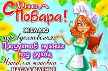 Поздравляем наших любимых поваров с праздником! Желаем успеха у плиты, пускай с каждым днем в ваших золотых руках рождаются все новые и новые вкусные рецепты. Желаем всегда творческого вдохновения и отличного настроения, которое непременно станет лучшей приправой к вашим блюдам! Спасибо за ваш труд!