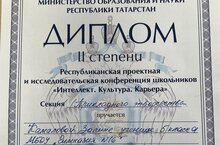 Поздравляем ученицу 5 Б класса Камалову Залину (научный руководитель: Панурина Е.В.) с Дипломом II степени в республиканской проектной и исследовательской конференции школьников «Интеллект. Культура. Карьера» в секции прикладного творчества. Молодец! Желаем дальнейших успехов!