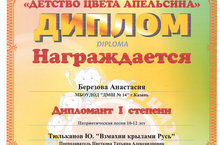 22-23 ноября 2014 года прошел ежегодный международный фестиваль-конкурс детского и юношеского творчества "Детство цвета апельсин". Поздравляем Березову Анастасию, ученицу 5 класса, ставшую дипломантом 1 степени. МОЛОДЕЦ, Настя!