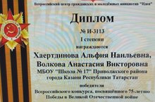 Поздравляем Хаертдинову Альфию Наильевну и Волкову Анастасию Викторовну, победителей всероссийского конкурса, посвященного 75-летию Победы в Великой Отечественной войне "Та война отгремела много весен назад..."