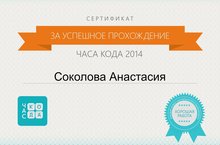 Соколова Анастасия из 9Б получила сертификат "За успешное прохождение часа кода 2014"