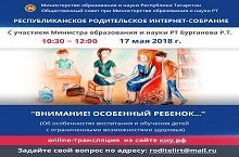 Уважаемые родители и учащиеся! Приглашаем вас принять активное участие в Республиканском родительском интернет – собрании «Внимание! Особенный ребенок…» (Об особенностях воспитания и обучения детей с ограниченными возможностями здоровья) с участием Министра образования и науки РТ Бурганова Р.Т., online – трансляция на сайте киу.рф будет вестись 17 мая 2018 г. с 10.30 – 12.00. Задайте свой вопрос по адресу:roditelirt@mail/ru
