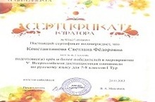 Константинова С.Ф. , Курдибан О.Б. и Сафиуллина Г.М. подготовили участников республиканского конкурса сочинений «Будущее моей страны - в моих руках» муниципального уровня, который состоялся 26.11.13. Участники конкурса показали хорошие результаты. 1 место заняла Зиятдинова Диляра из 7б класса (её сочинение отправлено на республиканский этап). 3 место заняла Ермичева Женя из 8б класса. Латыпова Камила из 9а, к сожалению, не вошла в список призеров.