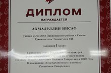 Поздравляем Ахмадуллина Инсафа, ученика 8А класса, занявшего 1 место в районном этапе Всероссийского конкурса среди юнармейских отрядов на лучшее знание государственной символики России и Татарстана в 2020 году в номинации "Государственная символика Республики Татарстан" и руководителя Гисматулова Р.И.