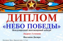 Юная звёздочка нашей школы, Фасхиева Диляра стала лауреатом 3 степени Международного многожанрового конкурса "Небо Победы". Конкурс приурочен к великому празднику- дню Победы! 02.05.2021