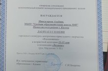 Поздравляем ученицу 9А класса Минсагирову Альбину с получением диплома 1 степени в городском конкурсе декоративно-прикладного творчества «Вдохновение» в возрастной категории 13-15лет Номинация «Вязание».