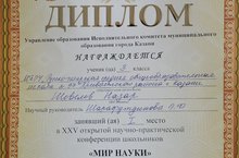 Ученик 3Б класса Шевелев Назар под руководством своего педагога Шарафутдиновой Э.Ф. занял I место в XXV открытой научно-практической конференции школьников "Мир науки" в секции "Русский язык и литературное чтение". Поздравляем!