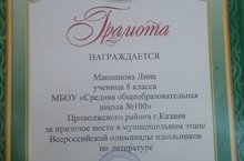 Поздравляем Маннапову Лину ученицу 8 класса за призовое место в муниципальном этапе Всероссийской олимпиады школьников по литературе.