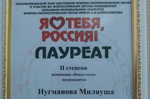 Поздравляем Нугуманову Миляушу с дипломом Лауреата II степени Республиканского этапа фестиваля военно-патриотической песни всероссийском детско-юношеском вокально-музыкальном конкурсе военно-патриотической песни имени А.В.Александрова"Я люблю тебя, Россия" 11.12.2019