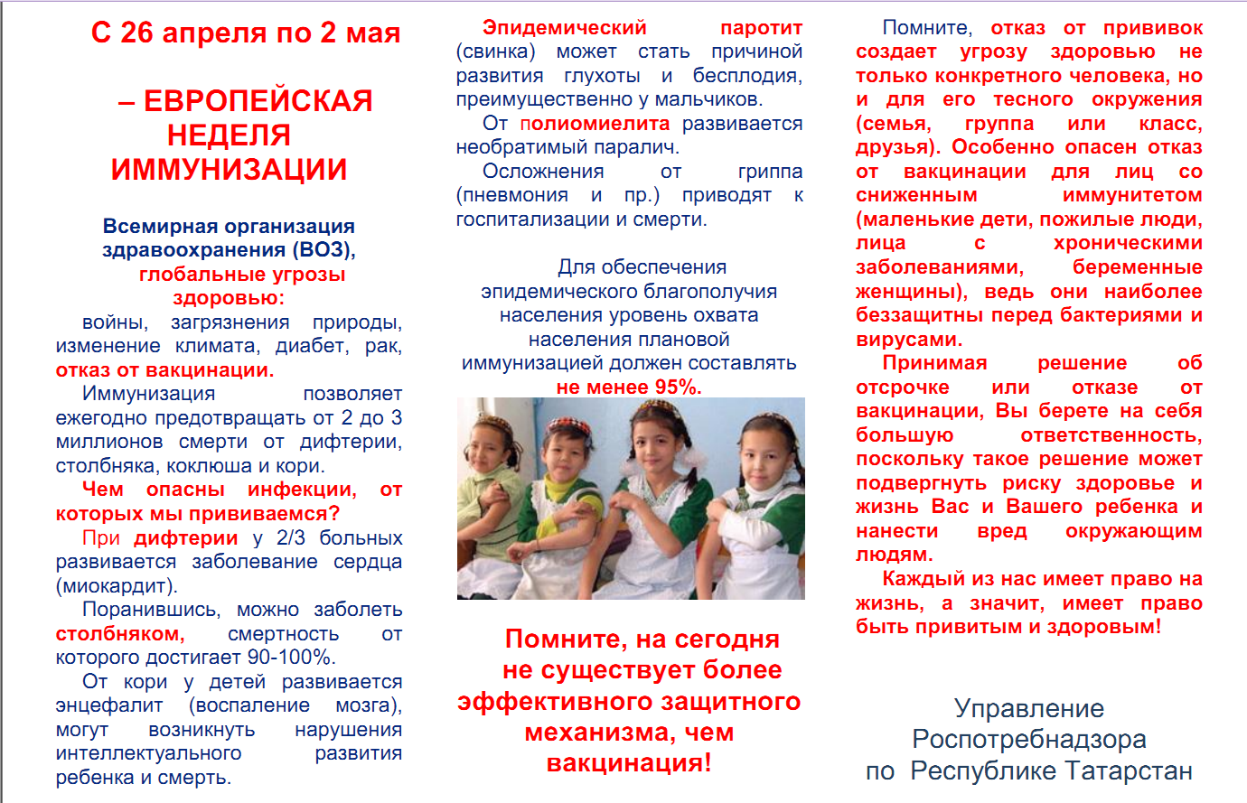 По инициативе Всемирной организации здравоохранения в Европе, в том числе в Российской Федерации и Республике Татарстан в период с 26 апреля по 2 мая 2021г. проводится Европейская неделя иммунизации