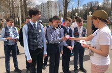 Ученики 5А и 6Б классов под руководством учителя истории и обществознания Нигматуллиной К.И. с флагами в руках и в пилотках побывали в роли юных волонтеров: раздавали людям старшего поколения символ Победы - Георгиевскую ленточку.