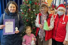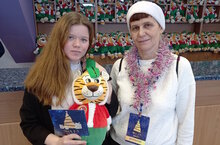 На елке встретились волонтер нашей школы учитель истории и обществознания Нигматуллина К.И. и ученица 10а класса Виктория Родионова. Награда Вике за победы - рюкзак со сладостями в виде мягкой игрушки - тигренка. Умница, так держать! -