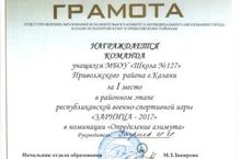 Поздравляем команду школы, занявших 1 место в районном этапе республиканской военно-спортивной игры "Зариница 2017", руководитель Загриеев И.И.