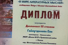 Поздравляем Гайнутдинову Еву с Дипломом 3 степени в Республиканском конкурсе литературного чтения "В мире литературных мыслей", руководитель Шагимарданова Р.Р.
