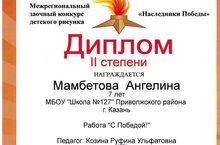 Поздравляем Мамбетову Ангелину с Дипломом 2 степени Межрегионального заочного конкурса детского ресунка "Наследники Победы", руководитель Козина Р.У.