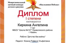 Поздравляем Киркину Ангелину с Дипломом 1 степени Межрегионального заочного конкурса детского ресунка "Наследники Победы", руководитель Козина Р.У.