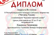 Поздравляем Гилязиеву Камиллу с Дипломом лаурета 3 степени 2 Республиканского конкурса детского творчества "Читаем Тукая", руководитель Гилимова В.А.