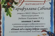 Поздравляем Гарифуллину Сабину с Грамотой за 1 место в райном конкусе "Новыйгод в сказку добрую зовет", руководитель Гилязива А.Н.